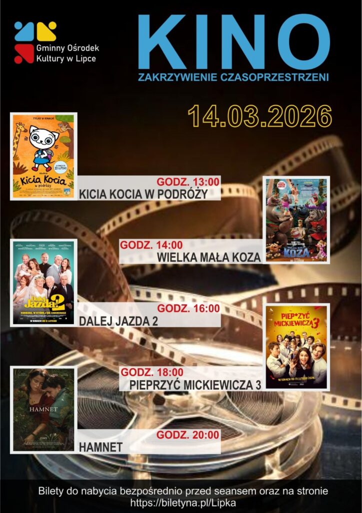 Informujemy, że Gminny Ośrodek Kultury w Lipce nie dystrybuuje biletów na seanse filmowe.
