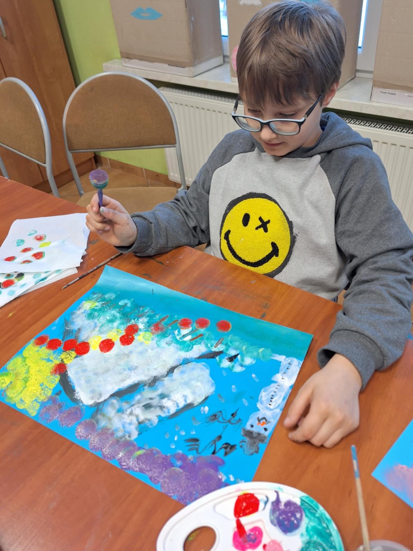 Podczas zajęć manualnych w WDK w Wielkim Buczku dzieci miały okazję wykazać się kreatywnością i artystyczną wyobraźnią 🎨✨ Za pomocą farb malowały zimowy pejzaż ❄️🌲, a inspiracją do prac była również niezwykła zorza polarna 🌌, którą niedawno można było zaobserwować nad naszymi miejscowościami 🌠. Zajęcia sprawiły uczestnikom wiele radości 😄 i pozwoliły na twórcze spędzenie czasu 🤍, a powstałe prace zachwycały kolorami i pomysłowością 🖌️🎨. Było to nie tylko spotkanie z plastyką, ale także z pięknem zimowej przyrody ❄️✨