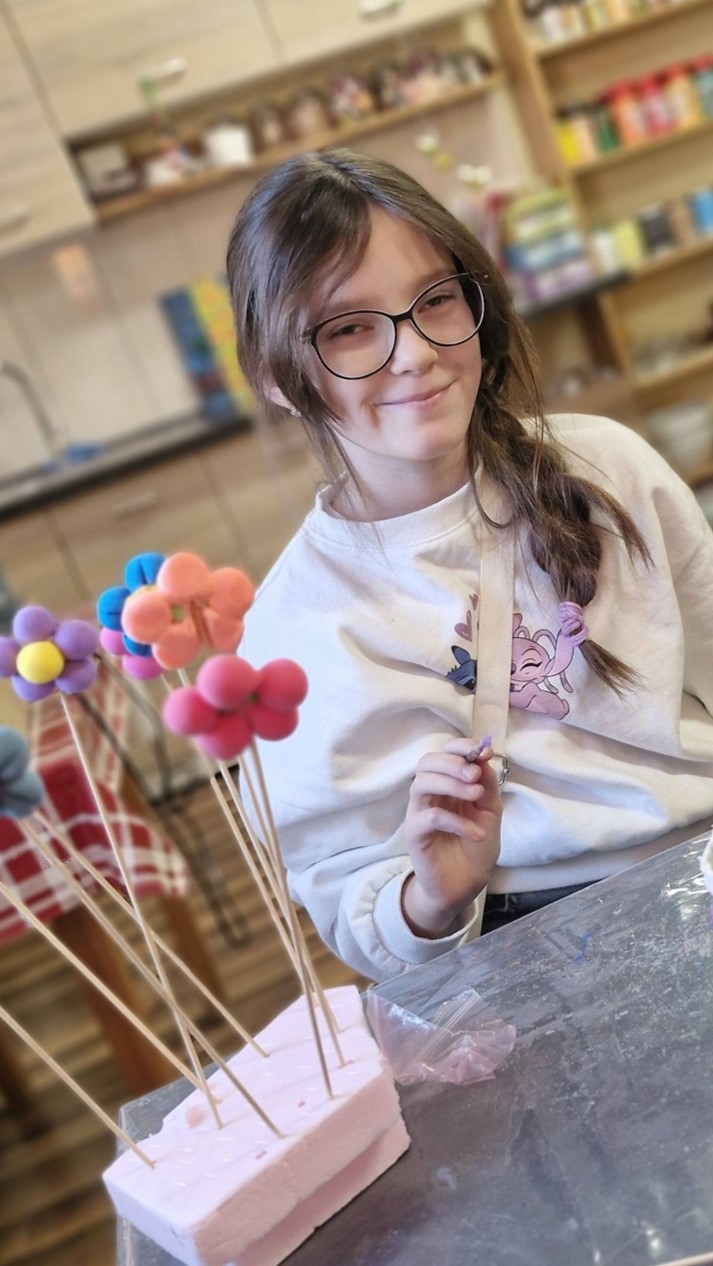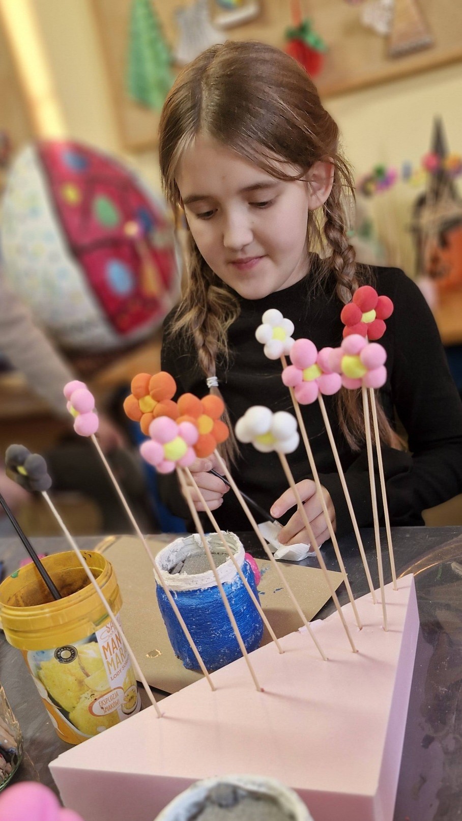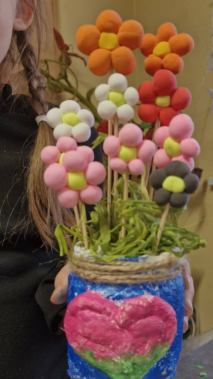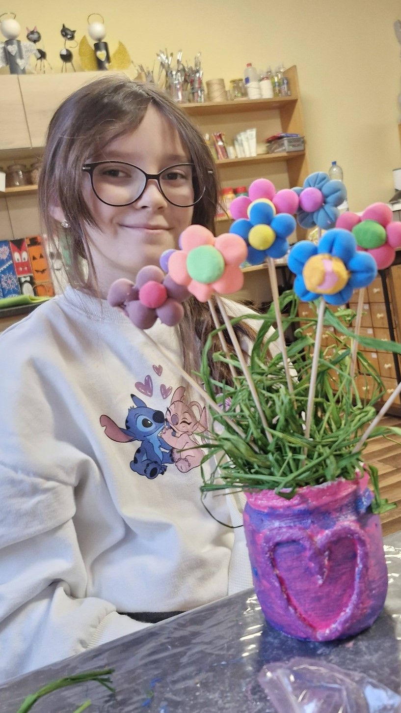 Dzieci na zajęciach wykonały kolorowe wazony oraz kwiatki. Prace posłużyły jako dekoracje, a niektóre z nich trafiły również jako miłe upominki, m.in. z okazji Dnia Babci